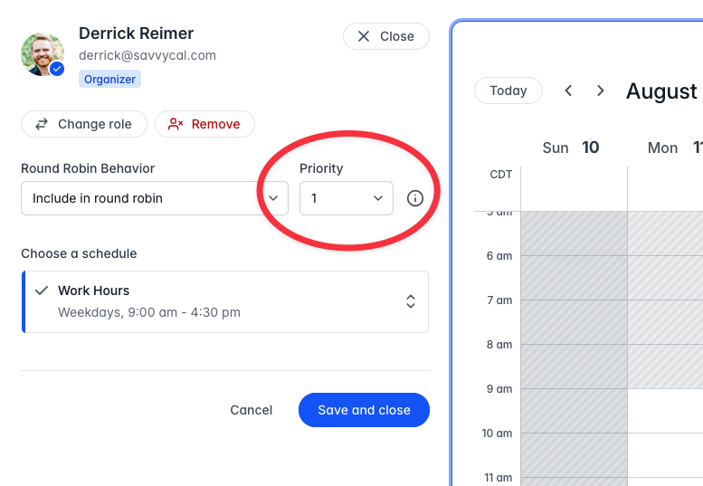 The priority setting on round-robin link attendees allows you to specify which members of the round-robin pool should be given priority when we automatically assign an organizer.